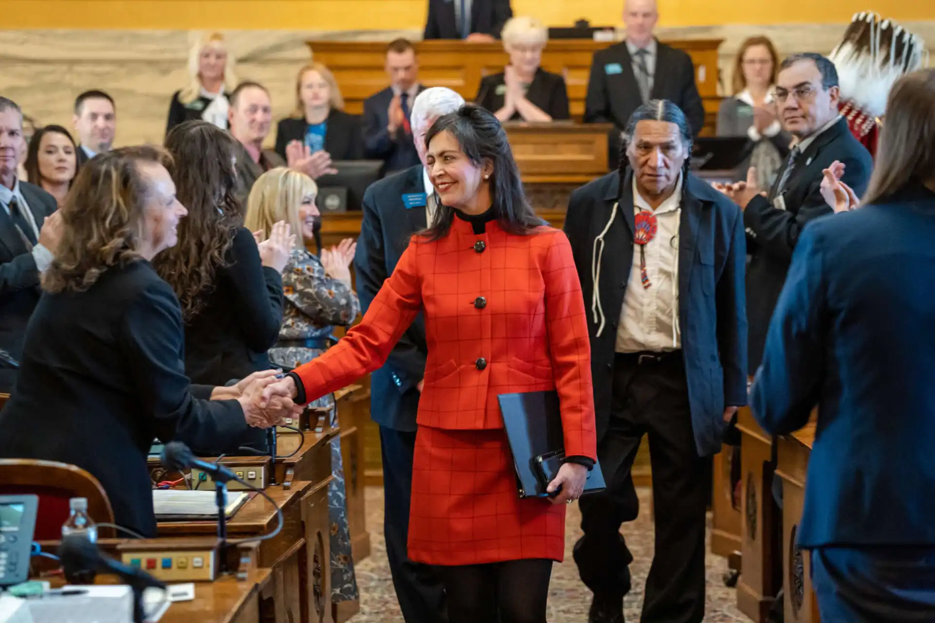 Secretary Christi Jacobsen receives applause following her speech in the House.