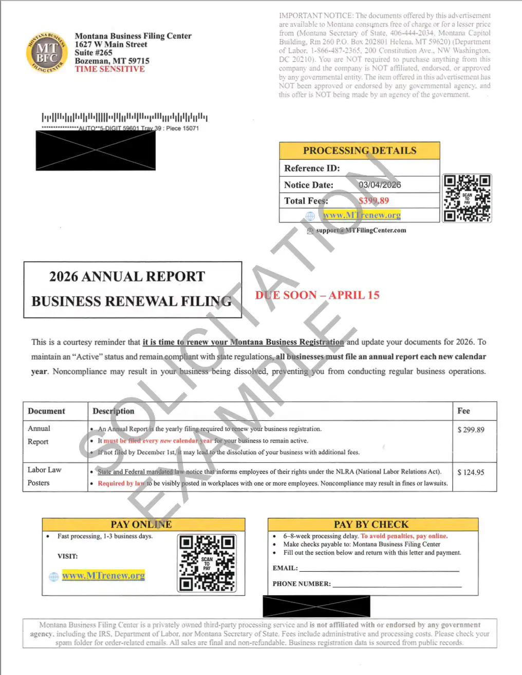 These mailings and emails often come from companies using names that appear official. These companies are not affiliated with the Montana Secretary of State’s Office or any government agency.