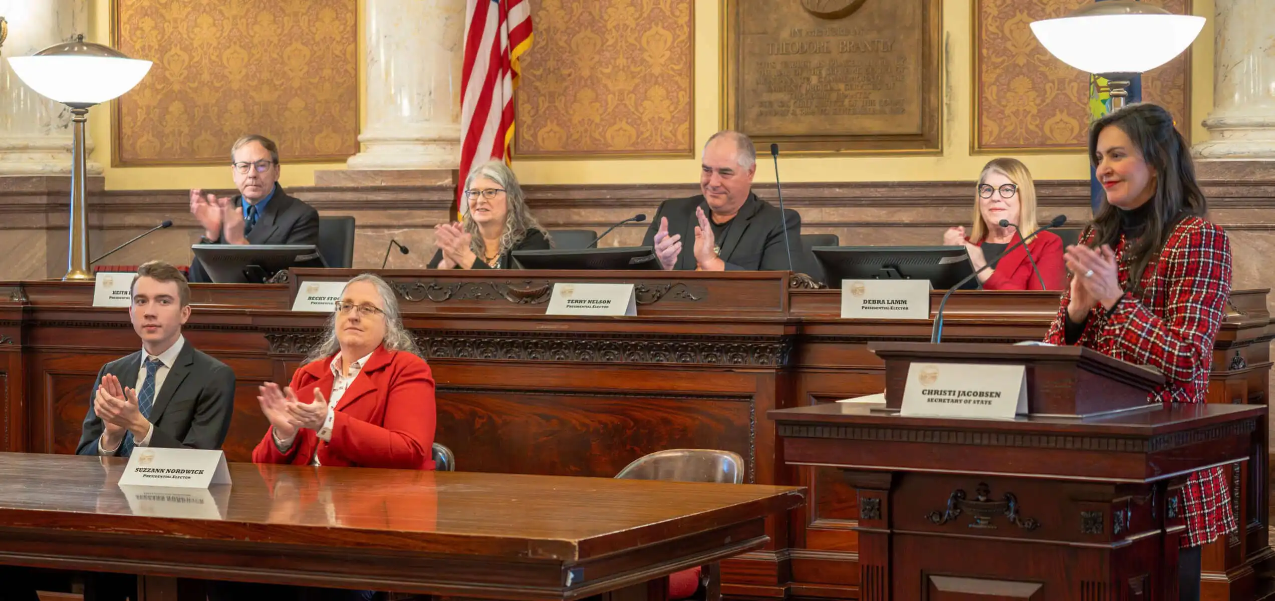 A woman stands at a podium speaking while five people seated behind her and two at a table in front applaud. An American flag is displayed in the background of Montanas Electoral College meeting in a formal, wood-paneled room.