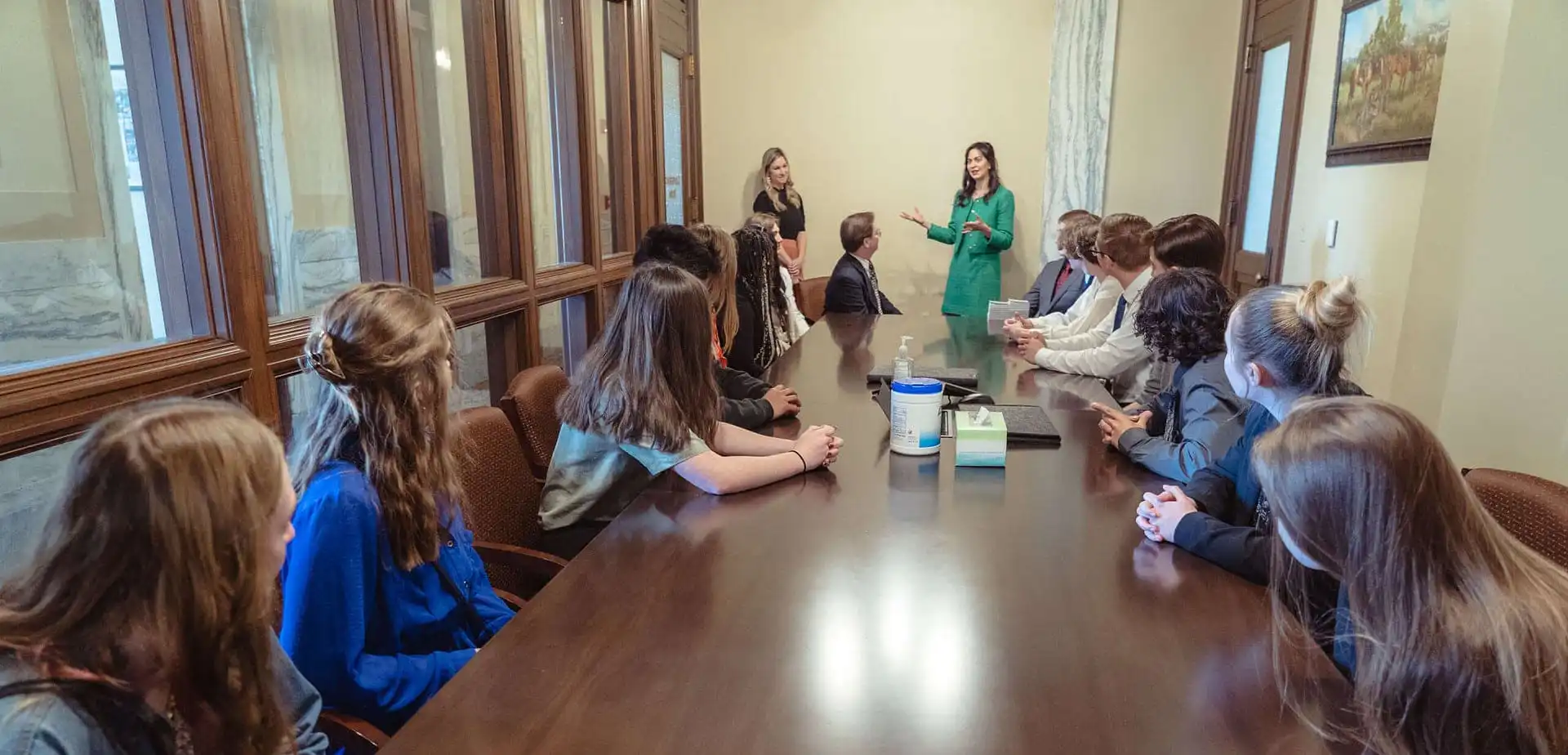 Students and staff, including social studies department chair Mr. Wesley Wells, traveled from the Bitterroot to visit the Secretary of State’s Office, hearing from Secretary Jacobsen about the responsibilities and duties of the SOS. Secretary Jacobsen explained the office’s role in elections, business registration and filings, her service on the Montana Land Board, and more.